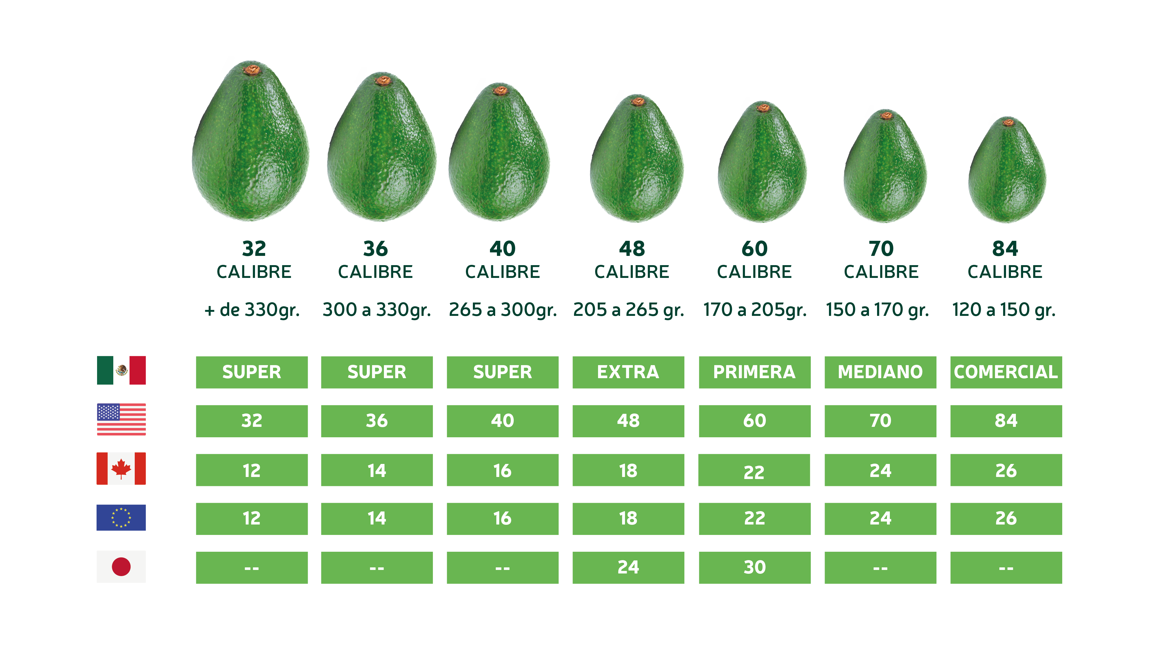 El calibre del aguacate lo determina el mercado internacional y su demanda, seleccionándolo a partir del tamaño y la cantidad de aguacates que caben en una caja.